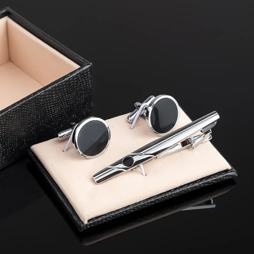 High Quality Wholesale Round Shape Copper Enamel Silver Cufflinks and Tie Clips Set SC5074